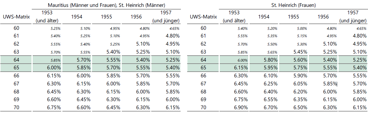 Bitte beachten Sie, dass die Umwandlungssätze an die Jahrgänge der Versicherten gebunden sind. Das heisst konkret, dass ein versicherter Mann mit Jahrgang 1956 unabhängig vom effektiven Pensionierungsjahr einen Umwandlungssatz von 5.55% im Alter 65 hat, entsprechend reduziert resp. erhöht bei vorzeitiger oder aufgeschobener Pensionierung. Für die Versicherten im geschlossenen St. Heinrichplan wird zusätzlich der Umwandlungssatz für Frauen und Männer gleichgesetzt. Der Stiftungsrat hat dafür eine Übergangsfrist von 3 Jahren beschlossen.